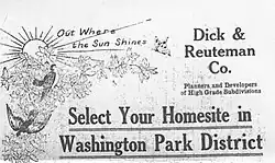 During the 1920s to 1950s, city boundaries at the time ended at 27th Street. The Town of Wauwatosa ran from what is now 27th Street to 124th Street. Ads began to run in the daily papers or on posted bills. An example of three ads from the period marketing property around Washington Park are pictured. The plotting of lots were completed and many houses were constructed during the period of 1920-1929. Sanborn maps were created and fire insurance risks were calculated for this region. Most homes were of frame construction. The subdivision developments of the Martin Drive neighborhood were the Park Front, Highland, Schmoldts, and Menomonee plats.