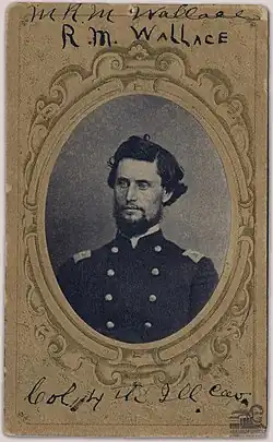 Upon the outbreak of the Civil War, Wallace helped to organize the 4th Regiment Illinois Volunteer Cavalry. He received a commission of major for the regiment on October 12, 1861.[1] He served under former law associate Colonel Theophilus Lyle Dickey. He led a battalion at the battles of Fort Henry, Fort Donelson, and Shiloh. At the latter engagement, Wallace's brother W. H. L. Wallace was killed. Martin R. M. Wallace assumed control of the 4th Illinois Cavalry Regiment following the death of Colonel William McCullough in December 1862. Wallace was promoted to lieutenant colonel on January 5, 1863, and to a full colonel on June 3, 1863.[1] Wallace was mustered out of the volunteers on November 3, 1864.[1]