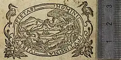 Martinus Nutius Meranus (1515—1558) was born at Meer, near Hoogstraten, and sometimes went by the name Vermeere ("of Meer"). He became a burgher of Antwerp on 31 December 1544, having been a member of Antwerp's Guild of St Luke since 1540.[1] In 1541 his address was In Sint Jacob, naest die Gulden panne, op die pleijne van de Iseren waghe[needs translation]. In 1543 he was buyten die Camerpoorte in den Gulden Eenhoren[needs translation], in 1544, at the sign of the Fox, and from 1546, in de twee Oeyvaerts (the two storks) on the Corte Camerstraet. His printer's mark became two storks, one carrying a fish or an eel to the other (a needle replaced the fish or eel from 1552). His motto was Pietas homini tutissima virtus (Piety is the most secure virtue for men).[1]