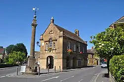 The hamstone Market House on Church Street was completed about 1785.[31] It is a Grade II listed building.[32] A grant of £190,000 was obtained from the Heritage Lottery Fund to restore the building and establish a community office on the ground floor in 2008.[33] In front of the Market House is a Market Cross, also known as The Pinnacle, with a column which dates from 1741 with a fluted Tuscan order column, on a stepped plinth, which supports a ball finial crowned with a wrought iron weathervane.[34]