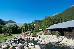 The settlement is named for the nearby hot springs. While not as commercially exploited as other southern hot water springs (such as those at Hanmer Springs) it is still a popular spot with visitors.[3] Water at 55 °C (131 °F), or more, is pumped from springs and from a well to a hotel, Japanese bath house, six private spas and two rock pools.[4] The hot spring is probably fed through the nearby Awatere Fault.[5]
