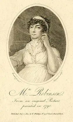 Mary Robinson (née Darby; 27 November 1757 – 26 December 1800) was an English actress, poet, dramatist, novelist and celebrity figure. She lived in England, in the cities of Bristol and London; she also lived in France and Germany for a time. She enjoyed poetry from the age of seven and started working, first as a teacher and then as an actress, from the age of 14. She wrote many plays, poems and novels. She was a celebrity, gossiped about in newspapers, famous for her acting and writing. During her lifetime she was known as "the English Sappho".[1][2] She earned her nickname "Perdita" for her role as Perdita (heroine of Shakespeare's The Winter's Tale) in 1779, and was the first public mistress of King George IV while he was still Prince of Wales.
