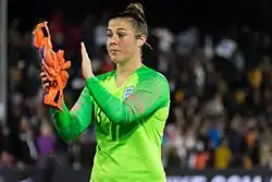 She previously played for WSL clubs Manchester United, Bristol Academy, Birmingham City, Doncaster Belles, and Reading, and in the Bundesliga with VfL Wolfsburg.[3][4] Earps has represented England at under-17, under-19, and under-23 levels,[5][6][7] and won her first senior cap in 2017.[8]