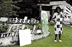 Smith's work was often created on readily available materials, such as plywood, corrugated tin and other recycled parts.[3] In her earlier work, she often used only one or two colors of paint. Her stylized imagery "recalls West African ceremonial masks" and many are allegorical.[6] Her art has been likened to artists like Jean-Michel Basquiat.[8] Her work was also very personal in nature. One of her favorite themes was to paint portraits of family, friends and neighbors.[4] Many of her works feature figures with their arms upraised, an image associated with ecstasy or spiritual enlightenment.