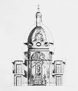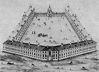 Marywil was built some time between 1692 and 1697 by Maria Kazimiera,[1] the Queen of Poland, to commemorate the victory of her husband, King John III of Poland over the Turks in the Battle of Vienna.[2] A large, pentagonal baroque building was designed by Tylman Gamerski and modelled after Place des Vosges and Place Dauphine in Paris. The building, bearing strong resemblance to Spanish baroque town market squares, contained shops and houses of the merchants, while the central square was used as a marketplace.[2] The small apartments with depots were leased to foreign merchants who competed with local tradesmen. The northern edge of the complex housed a chapel to the Holy Mother of Victories.[2] The building also served as a royal residence.[3]