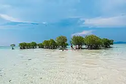 The city's territory, with 37.6 kilometres (23.4 mi) of shoreline, includes 300 square kilometres (120 sq mi) of municipal waters, 1,240 hectares (3,100 acres) of mangroves, 560 hectares (1,400 acres) of coral reefs, and 400 hectares (990 acres) of sea grasses. Residential land use covers 229.920 hectares (568.14 acres); commercial 15.0515 hectares (37.193 acres); fish ponds 252.9759 hectares (625.117 acres); and institutional 2,813.9192 hectares (6,953.346 acres).