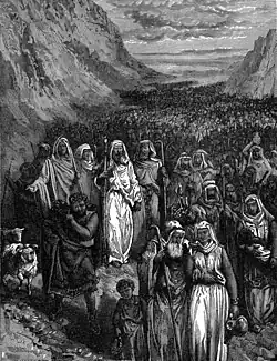 In the second reading, the Israelites journeyed from the Sea of Reeds to the wilderness of Sin to Dophkah to Alush to Rephidim to the wilderness of Sinai to Kibroth-hattaavah to Hazeroth to Rithmah to Rimmon-perez to Libnah to Rissah to Kehelath to Mount Shepher Haradah to Makheloth to Tahath to Terah to Mithkah to Hashmonah to Moseroth to Bene-jaakan to Hor-haggidgad to Jotbath to Abronah to Ezion-geber to Kadesh to Mount Hor.[5] At God's command, Aaron ascended Mount Hor and died there, at the age of 123 years.[6] They journeyed from Mount Hor to Zalmonah to Punon to Oboth to Iye-abarim to Dibon-gad to Almon-diblathaim to the hills of Abarim to the steppes of Moab.[7]