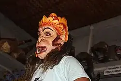 These masks or (Mukha) are of various kinds like– Mukh mukha (mask covering the face), Bor mukha (mask+costume, covers whole of the body), and Suti Su Mukha (smaller than Bor muka, but more compact) and are made of biodegradable materials such as bamboo, cane, potter's clay (Kumar mati), cow dung, jute fiber, paper cloth etc.[2] It usually takes a period of 10 to 15 days to make one mask and traditionally hengul and haital were used for colouring the masks, but presently due to unavailability of those materials water-colour and chemical dyes are also in use.[3][4] Till recent decades, the masks were stiff and didn't allow the actor to portray any facial expression but innovations brought by Padma Shri awardee Dr. Hemachandra Goswami has changed this. Despite its cultural significance, it is not widely embraced. This art is only prevalent in Upper Assam, especially in Majuli island, and only managed to survive in a plenty of Satras. [5]
