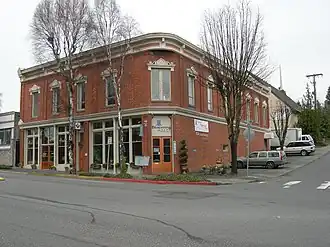 In the spring of 1889, Church purchased the Kirkland grocery store of J.J. Tompkins and became a businessman. He was appointed Kirkland's postmaster in June 1890 and by the end of the year, with Peter Kirk's plans for the town nearing certainty, Church joined forces with Harry D. French, son of one of Kirkland's earliest pioneers, to construct a $12,000 brick building at the Northeast corner of Market Street and Picadilly (now Seventh Avenue) to accommodate their businesses as well as the post office.[4] Church and French purchased the 4 lots on the corner from the Kirkland Land & Improvement Co. on February 13, 1891 for $3,100 (About $89,300 in 2019) but it is unclear whether the building, which occupies the southern 2 lots, was completed by this time. Though the building topped out at 2 floors, its walls were reported to be thick enough to support an eventual third floor if needed.[5] In 1894, Church would be removed from the position of postmaster due to what reports called "offensive partisanship" (He would be succeeded by C.C. Filson, who would later found the Filson Company in Seattle).[6] In later years, E.A. Brooks operated the grocery store in the building and lived upstairs with his family. When Brooks had his own building built further down Market Street in 1907 (still standing), he moved his store and the post office into the new quarters. In the 1920s a Mr. Evans operated a variety store in the southern half of the building for a time while the other storefront was used as a band practice space. In the later 20's the ground floor was used for automotive storage. The corner store was later used as a plumbing shop then a cabinet shop.[2]