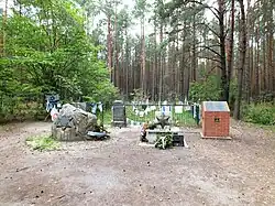 At the site of the massacre in the forest there are four monuments. The first, a communist era Polish monument, contains no reference to Jews. The second and third were erected by American Jews. The fourth, erected due to the efforts of Abraham Kapice, is in the shape of the Star of David and inscribed in Hebrew so that Israeli school children will be able to read it.[9]