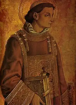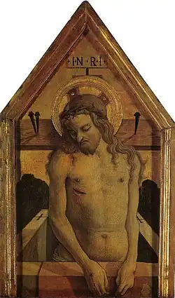 The Massa Fermana Altarpiece is a 1468 tempera and gold on panel by the Italian painter Carlo Crivelli, held in Santi Lorenzo e Silvestro church in the town of Massa Fermana. It is signed "KAROLVS CRIVELLVS VENETVS PINXIT HOC OPVS MCCCCLXVIII".[1] It is his earliest known surviving work and is notable for dating his return to Italy.[2]
