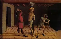 The predella shows narrative scenes, rare in the artist's production. The inspiration from Mantegna's San Zeno Altarpiece is evident for the scenes (excluding the Flagellation), attempting to convey the drama of the events even more, as can be seen clearly in the Crucifixion where the elderly Mary is transfigured by a grimace of pain. The soldier lying foreshortened in the Resurrection is an explicit quotation of the Transport of Saint Christopher frescoed in the Ovetari Chapel in Padua. The Flagellation instead would refer to the perspective solutions of Paolo Uccello who worked in Urbino in that year, in particular the scenes of the Miracle of the Profaned Host.