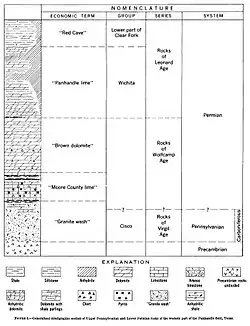 The Panhandle Field is a structural trap, characterized by the Amarillo-Wichita Uplift or sometimes referred to as the buried "Amarillo mountains", which is bounded by three sedimentary basins: the Anadarko Basin to the north, the Dalhart Basin to the west, and the Palo Duro Basin to the south.[16][17] This tectonic uplift occurred in the Late Mississippian to Early Pennsylvanian time and was sufficient to expose and erode the Precambrian granitic and rhyolitic basement complex forming a granitic wash, which was subsequently submerged and buried by marine sediments in the Permian (specifically, the Wolfcampian carbonates).[18][17] The granitic wash and these marine sediments form the pay zones but the "gas, oil and water cut across formational boundaries".[19] The Wolfcampian marine sediments include an arkosic lime, an arkosic dolomite, the Moore County Limestone, the White Dolomite, and the Brown Dolomite.[19] The Leonardian Panhandle Lime, or Wichita, and Red Cave overlay these Wolfcampian sediments, with the anhydrite and dense-dolomite nature of the Wichita forming the reservoir seal.[14][20] The source for the oil, gas and helium accumulations are the sedimentary rocks of Pennsylvanian age in the Palo Duro and Anadarko Basins.[21][22] The helium would have been derived from uraniferous rocks and radiogenic in origin.[23] The Panhandle Field has a pressure which is about 400 psi lower than the surrounding basins, which allows gases to migrate into it.[24] Although low, the pressure is at normal hydrostatic pressure relative to the water table.[25] Charles N. Gould mapped the John Ray Dome, which was drilled by the Amarillo Oil Company in 1918 resulting in the Panhandle Field discovery.[21] Drilled to a depth of 2,395 feet, the well, No. 1 Masterson C, produced 5 million cubic feet of gas per day at a pressure of 420 psi.[26] Oil in the Panhandle Field was discovered in 1921 with Gulf Producing Company's No. 2 Burnett well, producing 200 barrels per day.[27]