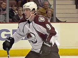 Duchene recorded his first career NHL point in his Avalanche debut on October 1, 2009, against the San Jose Sharks with an assist on a powerplay goal by John-Michael Liles.[7] Duchene's first goal came later that month on October 17 against Chris Osgood in a 4–3 shootout win over the Detroit Red Wings.[8] The following day, it was announced that Duchene would spend the entire season with the Avalanche instead of being reassigned to the Battalion.[9] On November 30, Duchene compiled his first two-goal NHL game in a 3–0 shutout victory against the Tampa Bay Lightning.[10] On December 2, he recorded his second two-goal game and first three-point game in a 6-5 shootout loss to the Florida Panthers.[11] It marked the first time that an 18-year-old recorded back-to-back two-goal games in the NHL since Radek Dvořák did so with Florida in November 1995.[12] Duchene was subsequently selected as the NHL Rookie of the Month for December 2009 after scoring 5 goals and 8 assists for 13 points in 14 games.[12]