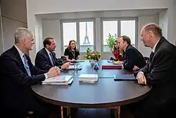 Hancock served as Minister of State for Energy from 2014 to 2015.[23] In this role he was criticised for hiring a private jet with senior diplomatic officials to fly back from a climate conference in Aberdeen, where he signed a deal with Mexican President Enrique Peña Nieto to use British expertise in Mexico. A Department of Energy and Climate Change (DECC) spokesman said the chartered flight was organised to fit around diary commitments, and the conference was not about climate change, but it was a visit to a university and discussion about investment.[24] Hancock was later criticised for accepting money from a key backer of climate change denial organisation, Global Warming Policy Foundation.[25]