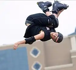 Matt Lindenmuth (born March 1, 1981) is an American formerly top-ranked professional vert skater, as well as a professional snowboarder. He is most known for being the first action sports athlete in the world to do a double backflip on a vert ramp, often referred to as a "Double Lindy". At the 2002 Summer X-Games Lindenmuth attempted but failed to pull off the first ever triple backflip on a vert ramp.