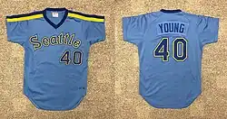 Young was born in Pasadena, California in 1958, and attended the University of California, Los Angeles (UCLA). While at UCLA, he was drafted by the Seattle Mariners in the second round (32nd overall) of the 1980 Major League Baseball draft.[1] He made his major league debut in 1983 with the Mariners, eventually finishing the season with an 11–15 record games over 203+1⁄3 innings, with a 3.27 earned run average in 33 games (32 starts), good enough to rank in the top ten for ERA that season.[2] He represented the Mariners in the 1983 Major League Baseball All-Star Game, where he pitched a scoreless eighth inning facing Johnny Bench, Darrell Evans and Pedro Guerrero.[3]