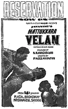Maattukkara Velan (transl. Velan, the cowherd) is a 1970 Indian Tamil-language action drama film directed by Pa. Neelakandhan. It is a remake of the 1966 Kannada film Emme Thammanna.[2] The film stars M. G. Ramachandran, Jayalalithaa and Lakshmi, with S. A. Ashokan as the villain. It was released on 14 January 1970[3] and ran for 100 days.