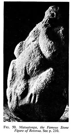 Matuatonga is a Māori stone sculpture on Mokoia Island, Lake Rotorua, New Zealand, which is a mauri (relic) or whakapoko (guardian statue) and belongs to Ngāti Whakaue, Ngāti Rangiteaorere, and other tribes of Te Arawa.[1] It is the most famous atua kumara (agricultural god) and was traditionally involved in rituals connected to the sowing of the annual kumara (sweet potato) crop. The sculpture has a male figure carved on each side, one representing Matuatonga, god of growth, and the other Matuatehe, god of decay. According to some traditions, Matuatonga was brought to New Zealand from Hawaiki c. 1350. It was buried in the 1820s and exhumed in 1866, at which point a smaller sculpture was given to Governor George Grey and deposited in the Auckland Museum. Some sources claim that this smaller sculpture is the "true" Matuatonga and that the one on Mokoia today is only a replica.