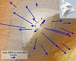 Summit inflation as measured via GPS between June 2004 and April 2005; arrows denote between 1 and 10 cm (0.4 and 3.9 in) of growth.