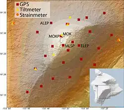 The modern monitoring system on Mauna Loa consists not only of its local seismic network but also of a large number of GPS stations, tiltmeters, and strainmeters that have been anchored on the volcano to monitor ground deformation due to swelling of Mauna Loa's subterranean magma chamber, which presents a more complete picture of the events proceeding eruptive activity. The GPS network is the most durable and wide-ranging of the three systems, while the tiltmeters provide the most sensitive predictive data, but are prone to erroneous results unrelated to actual ground deformation; nonetheless a survey line across the caldera measured a 76 mm (3 in) increase in its width over the year preceding the 1975 eruption, and a similar increase in 1984 eruption. Strainmeters, by contrast, are relatively rare.[77] The Observatory also maintains two gas detectors at Mokuʻāweoweo, Mauna Loa's summit caldera, as well as a publicly accessible live webcam and occasional screenings by interferometric synthetic aperture radar imaging.[76]