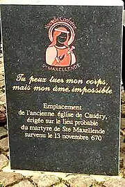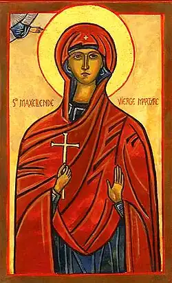 Maxellende's martyrdom occurred during the Merovingian period, under the episcopate of Vindicien, bishop of Arras and Cambrai. She was the daughter of Huinlinus, a wealthy landowner from Caudry. Her legend holds that she was promised to Harduin d'Armeval, future lord of Solesmes. She resisted the prospective marriage because of her religious commitment, which led Harduin to kill her in 670, and after which he was blinded.[1][2]