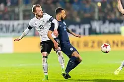 The following season, Arnold started in the opening match against Hannover but was sent off after just thirty minutes. He subsequently lost his place in his club and had to wait months before returning. However, upon his return, Arnold scored four goals in five matches to help the club qualify for the following season's Europa League.[9] Arnold's form throughout the season caught the attention of German national team coach Joachim Löw who eventually handed him his first senior call-up.[10][11] He carried his form into the 2014–15 season where Wolfsburg ended as runners-up to Bayern Munich and won the DFB Pokal after beating Borussia Dortmund 3–1.[12][13]