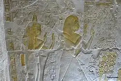 The first full season's work on Maya's burial in early 1987 indicated that his tomb is "a slightly smaller and abbreviated version of Horemheb's Saqqara tomb. An open courtyard has a collanade on its west side and doors leading to three vaulted ceilings. An inner courtyard has been found to contain reliefs of very fine quality and a statue of Maya and his wife."[6] The underground burial chambers were paved with limestone and decorated with reliefs showing Maya and his wife in front of gods.