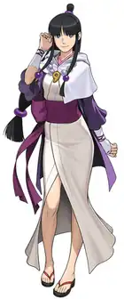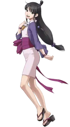 Maya was originally designed with clothes typical for traditional Japanese spirit mediums, including a kimono and a magatama bead; the kimono design was altered compared to the source material, however, with the hem drastically shortened.[18] For situations when she channels Mia's spirit, her design changes: her hair and clothing remains, while her face and body change, looking like Mia's, with the intent of emphasizing the difference in their bust sizes.[19] She is given yet another alternative design for part of the third game, Trials and Tribulations, where she wears a waitress uniform, replacing all of her regular clothes and accessories save for the beads in her hair.[20] Because Takumi wanted the first three Ace Attorney games feel like three installments in one larger work, he wanted to avoid a situation where the first game looks outdated compared to the third: because of this, Maya and other major characters such as Miles Edgeworth and Phoenix retain the same character graphics throughout all their appearances in the first three games.[21]