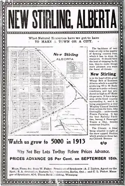 The new junction was built at the West 1/2 of Section 32, Township 6, Range 19, West of 4th Meridian. This would turn out to be an ideal location for a new community to be established. Mr. William Fisher, a real estate promoter and newcomer to Alberta, took advantage of this and created "The Stirling Townsite Syndicate", which establish the community of, New Stirling. Mr. Fisher bought up a majority of the lots and began to advertise promotional posters as far as Eastern Canada to promote the new hamlet. Many posters stated, "Watch us Grow to 5,000 in 1913"; others were absurd, depicting 18 Mile Lake (Stirling Lake) with a yacht, row boats and beautiful groves of trees lining the shores. For many who lived in the area, the lake was known as a smelly slough and the shores were nothing but barren semiarid grassland.