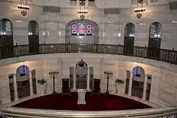 The mausoleum was designed with bronze gated side chambers, called "private rooms", which could contain five crypts (a "single room") or 10 to 12 crypts (a "double room").[16] In addition, niches could be filled with four to five tiers of crypts to create a "family section".[16] Interior bronze work, such as gates and doors, were cast and finished by the John Harsch Bronze Foundry Co.[16] The stained glass windows in the mausoleum were designed by Lovell & Lovell.[23] The bronze temple menorah in the chapel were designed by Walter A. Sinz of the Herman N. Matzen Studio, and cast by the J. Harsh Company. Their style was Byzantine. The shaft consisted of four pilasters, each resembling a Solomonic column, around a smooth, circular central piece. The menorah was 3 feet (0.91 m) wide and 7 feet (2.1 m) tall, and took a year to cast.[24] The mausoleum used a ventilation system, patented by Lovell, that provided fresh, dry air to each crypt to keep odor at a minimum and to prevent decomposition gases from building up and rupturing the vault.[16]