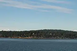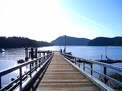 During the late 19th century, Mayne Island was the commercial and social centre of the Gulf Islands. The port at Miners Bay was always busy due to the steady stream of marine traffic travelling through Active Pass, the narrow, curving strait separating Mayne from Galiano Island to the north, which is the main ferry route between the Mainland and Vancouver Island today. The historic village at Miners Bay remains the commercial centre of the island, with the annual Fall Fair still being held at the old Agricultural Hall like so many years before. Miners Bay is also the site of the Springwater Lodge which was built in 1892 and remains the oldest continuously operated hotel in British Columbia.[2] Nearby Active Pass still throbs with a steady stream of marine traffic, a bustling contrast to the island's quiet interior byways. Village Bay, with its BC Ferries terminal, has several late 19th-century to 1930s buildings. Active Pass is named after the American survey ship USCS Active, the first steam vessel to navigate the pass.[3]