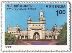 On 12 April 1986, the Indian Postal Service released a stamp showing the main building of Mayo College. The multicoloured stamp was designed by India Security Press. The first-day cover shows the emblem of the college. The cancellation was designed by Nenu Bagga.[5]