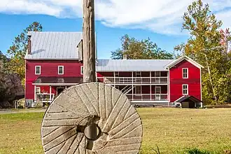 The 1845 mill is the present four-story building, its large hand-hewn beams supported by a thick stone foundation. It originally had the familiar overshot mill wheel, but it was replaced by a more efficient underwater turbine in the early 20th century. Grain was milled there until the mid-1900s, and the mill and connecting residence were adapted late in the century as a furniture workshop and bed-and-breakfast inn.