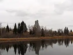 The McIntyre (Number 11) headframe was completed in 1927. The shaft, along with new shops, processing, administrative and change facilities were all located on the north shore of Pearl Lake. This led to the subsequent abandonment and demolition of the original mill located to the south west of the new facilities. The six-compartment shaft excavation underneath it was 4,250 feet (1,300 m) deep and 160,000 tons of rock, as well as 40,000 tons of water, were removed in the process. The project used 240,000 pounds of powder to blast the rock and 2,256,000 feet (688,000 m) of Douglas fir to timber the shaft.[2]: 128