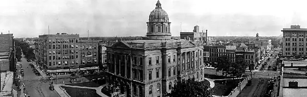 The McLean County Courthouse housed the McLean County Circuit Court from 1903 to 1976. The original construction was completed in 1868 at a cost of $461,640.[2] On June 19, 1900, a fire destroyed many of the buildings in the square and the courthouse. The courthouse was rebuilt in 1903 in a similar style following the fire. It was designed by William Reeves and John M. Baile of the Peoria firm Reeves and Baile.[3] The rebuild of many buildings in the downtown was executed through the designs of several local architects, George Miller, Paul Moratz and A.L. Pillsbury.[4]