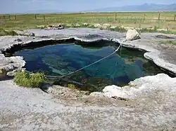 A system of hot springs, Meadow Hot Springs are located 1.6 miles from the center of town. The water emerges from an underwater cave in a travertine formation at 106 °F.[9]