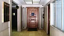 The interior of the building has been extensively remodeled, although some original features remain. The building's entry foyer contains pink marble walls, and two marble columns flank the lobby's central entrance. The lobby itself still retains some original marble wainscoting and plaster beams.[1] Nine columns border the two-story lobby of the first floor suite with crown molding and a large mezzanine above the original bank vault that has been remodeled and now serves the purpose of a kitchen.