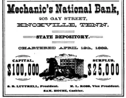 After O'Connor's death, Sanford served as the bank's president until 1883, when Knoxville businessman and future mayor Samuel B. Luttrell (1844–1933) was named president.[4] Luttrell remained president of the bank for several decades.[3] In 1900, the book, Standard History of Knoxville, reported that the bank had assets of $100,000 in capital, $110,000 in surplus, $500,000 in deposits, and $425,000 in loans and discounts.[4]