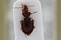 Mecyclothorax rufipennis is a species of ground beetle in the subfamily Psydrinae.[1] It was described by Liebherr in 2008.[1] Described as a small pale beetle with a standardized body length 4.0–4.9 mm. Elytra parallel-sided with striae 1–5 continuous with punctures present and stria 6 obsolete but traceable near elytral midlength. Elytra covered with more distinct transverse microsculpture consisting of very transverse sculpticells and transverse lines.[1] Pronotum posseses basolateral seti. This species is known from the Kohala Mts. and windward forests on Mauna Loa. If this species’ distribution is congruent with other occupants of the windward wet forests, populations on Mauna Kea are predicted.[1] This species to tell apart from Mecyclothorax konanus without dissection, as there is much overlap in size, color and external traits.