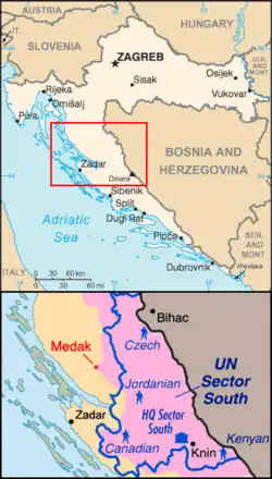 The pocket adjoined Sector South, one of the four United Nations Protected Areas (UNPAs) in Croatia. It was not actually in the UNPA but lay just outside in a so-called "pink zone"—RSK held territory outside the UNPAs, patrolled by UNPROFOR peacekeepers. Prior to the Medak Pocket offensive, Croatian government forces had launched several relatively small-scale attacks to retake rebel Serb-held territory in "pink zones" in the Miljevci plateau in June 1992 and the area of the Maslenica bridge in northern Dalmatia in January 1993—the Operation Maslenica.[17] It has been alleged that the timing of the Maslenica and Medak offensives was owed to the political imperatives of Croatian President Franjo Tuđman, who was facing political difficulties following Croatia's intervention in the war in Bosnia.[18]