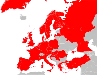 Map of all countries from which organizations have participated in at least one conference of the Meeting of European Communist Youth Organizations.