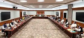 Narendra Modi, the Prime Minister of India, chaired the meeting which was held in New Delhi. The leaders from Jammu and Kashmir included four former chief ministers of the state, Farooq Abdullah, Omar Abdullah, Ghulam Nabi Azad and Mehbooba Mufti; four former deputy chief ministers, Kavinder Gupta, Nirmal Kumar Singh, Tara Chand, Muzaffar Hussain Baig, and other mainstream politicians from the region such as Jitendra Singh, Sajjad Lone, Bhim Singh, Ghulam Ahmad Mir, Altaf Bukhari and Mohammed Yousuf Tarigami.[1] The politicians represented eight mainstream political parties with presence in Jammu and Kashmir— Indian National Congress, National Conference, Peoples Democratic Party, Apni Party, Bharatiya Janta Party, Communist Party of India (Marxist), National Panthers Party and People's Conference.[2] Also present were Amit Shah, the Union Minister of Home Affairs; Ajit Doval, the National Security Advisor of India; and Manoj Sinha, the lieutenant governor of Jammu and Kashmir.[2][3]