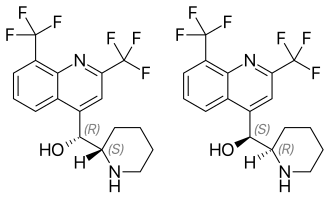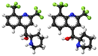 Mefloquine is a chiral molecule with two asymmetric carbon centres, which means it has four different stereoisomers. The drug is currently manufactured and sold as a racemate of the (R,S)- and (S,R)-enantiomers by Hoffmann-La Roche, a Swiss pharmaceutical company. Essentially, it is two drugs in one. Plasma concentrations of the (–)-enantiomer are significantly higher than those for the (+)-enantiomer, and the pharmacokinetics between the two enantiomers are significantly different. The (+)-enantiomer has a shorter half-life than the (–)-enantiomer.[14] Specifically it is used as mefloquine hydrochloride.
