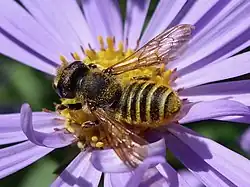 This species is found in the western United States, where it ranges from Montana and South Dakota to New Mexico, west to California and north to Oregon, and often inhabits meadows and gardens. The bee is black, but covered by golden/yellow hair on its face, behind its eyes, on its thorax, below its wings (which are blackish) and on its legs. The pollen basket of the species is located under its abdomen. As often found with most bees, Megachile fidelis feeds on the nectar of flowers - particularly the nectar of composite flowers. The nests of M. fidelis are created in almost exactly the same fashion as, M. perihirta, the Western Leafcutting Bee. However, adult bees do not leave their brood cells until all the cells between their cell and the end of the tunnel have been vacated. As with the case of many bees, larva grow extremely rapidly when in their brood cells. It is often found that this species of bee leave their nests around spring.[2]