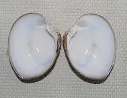 The valves are thick and of equal size. In life, the valves are covered by a grayish-brown periostracum. The external surface of the shell is smooth. It is tan to brown in color, sometimes with bands or speckles of different intensity. The interior of the shell is white, sometimes with bands of purple.[4] The shell can reach 120 millimetres (4.7 in) long, 97 millimetres (3.8 in) wide, and 68 millimetres (2.7 in) deep. Weight may reach 93 grams (3.3 oz) for live individuals.[5][6]