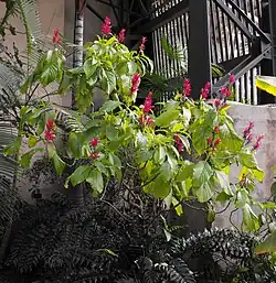 Megaskepasma is a monotypic genus of plants containing the single species Megaskepasma erythrochlamys, known by the common name Brazilian red-cloak. Native to Venezuela and Suriname,[1] it is a free branching, upright showy tropical shrub that grows to 3 m high with appressed reddish hairs, stout stems, and broad ovate 12–30 cm long dark green leaves with pink midrib. It is grown as an ornamental shrub in climates from warm temperate to tropical for its inflorescence, large erect heads of conspicuous crimson bracts, and two-lipped white flowers. This plant prefers a rich soil and is propagated from seed or cuttings.