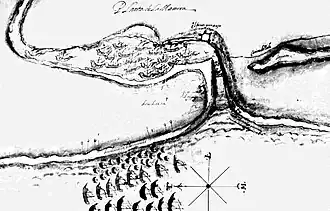 In order to secure the Spanish treasure fleet route Mehdya, known as La Mamora, was under Spanish rule between 1614 and 1681.[10] After occupying Larache in 1610, a Spanish fleet under Admiral Luis Fajardo captured Al-Ma'mura during the reign of Mulay Zidan in August 1614, due to the period of anarchy that followed the death of Mulay al-Mansur in 1603.[11] After negotiations with Mulay Zidan, they left a strong garrison of 1,500 men, and called the harbour San Miguel de Ultramar.[2] The works to build the Fortress of La Mamora along with the San Felipe bastion fort started immediately.[12]