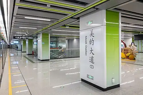 Meidi Dadao Station (Chinese: 美的大道站; pinyin: Měidì Dàdào Zhàn; Jyutping: mei5dik1 daai6dou6 zaam6; lit. 'Midea Avenue Station') is a station of Guangzhou Metro Line 7, located underground on the intersection of Yifeng Road and Midea Avenue in Foshan's Shunde District.[1] The station was opened on 1 May 2022, with the opening of the western extension of Line 7,[2][3] and is the western terminus of the line.