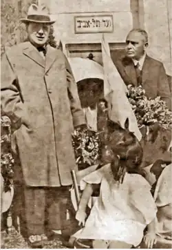 Winston Churchill visited Palestine in March 1921 and met with Dizengoff. During a ceremonial speech with Churchill, Dizengoff declared: “this small town of Tel Aviv, which is hardly 12 years old, has been conquered by us on sand dunes, and we have built it with our work and our exertions.” Churchill was impressed with the motivation and determination of the pioneers, under the leadership of Dizengoff. In Palestine, Churchill told an anti-Zionist delegation: “This country has been very much neglected in the past and starved and even mutilated by Turkish misgovernment… you can see with your own eyes in many parts of this country the work which has already been done by Jewish colonies; how sandy wastes have been reclaimed and thriving farms and orangeries planted in their stead.” That same day he told a Jewish delegation he would inform London that the Zionists are “transforming waste into fertile... planting trees and developing agriculture in desert lands... making for an increase in wealth and cultivation" and further that the Arab population is “deriving great benefit, sharing in the general improvement and advancement.”[4]